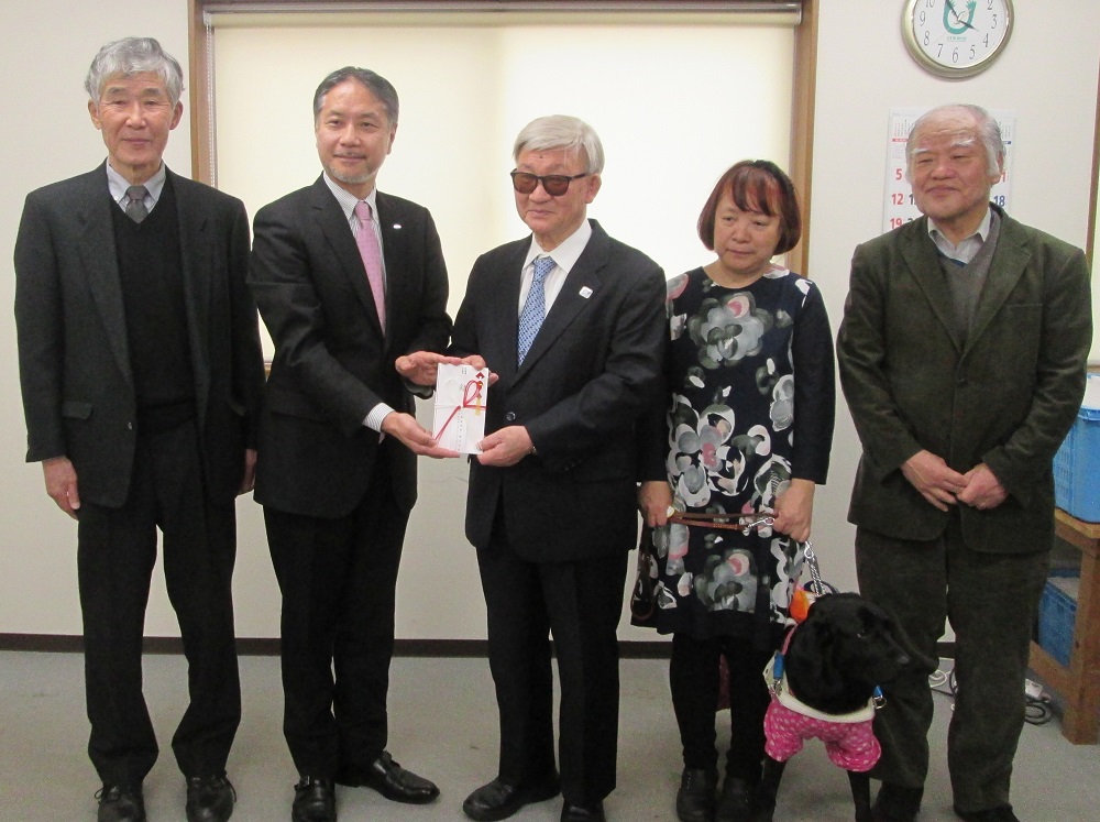 贈呈に先立ち、都盲協/笹川会長からは、寄付により2016年度は前年度に比べ多くの参加者を募れたことの報告と感謝が述べられ、au損保/久保田専務からは、次年度の活動でさらに多くの視覚障がい者の方々が楽しんで参加いただけるよう期待が述べられました。